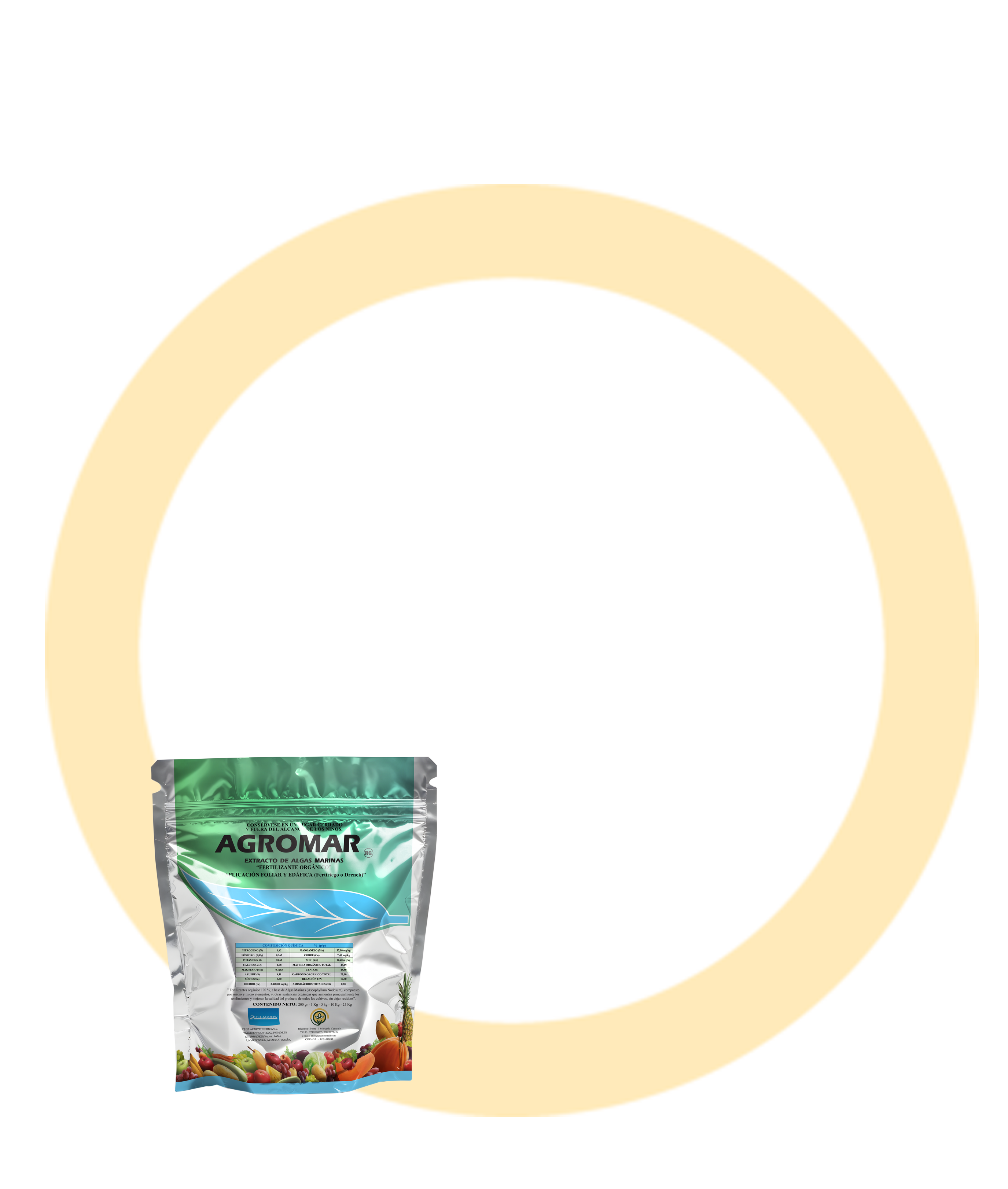 AGROMAR es un extracto natural de algas frescas Ascophyllum Nodosum, no contiene ningún aditivo artificial. Es un producto orgánico completamente balanceado con macro y micro nutrientes (biológicamente quelatado por carbohidratos), aminoácidos y promotores biológicos fitohormonales de auxinas, giberelinas y citoquininas. AGROMAR contiene hormonas naturales, que promueven dentro de la planta la liberación natural de auxinas, giberelinas y citoquininas en forma completamente balanceada. Esto permite una eficiente autorregulación en la disponibilidad de hormonas y corrige cualquier deficiencia que afecta los diferentes procesos fisiológicos de diferenciación. Las hormonas vegetales se producen naturalmente dentro de las plantas, estos reguladores de crecimiento son usados en la agricultura para aprovechar su capacidad como enraizantes, en la germinación de semillas, maduración de frutos, tolerancia a diversos tipos de estrés y el incremento de la producción.
